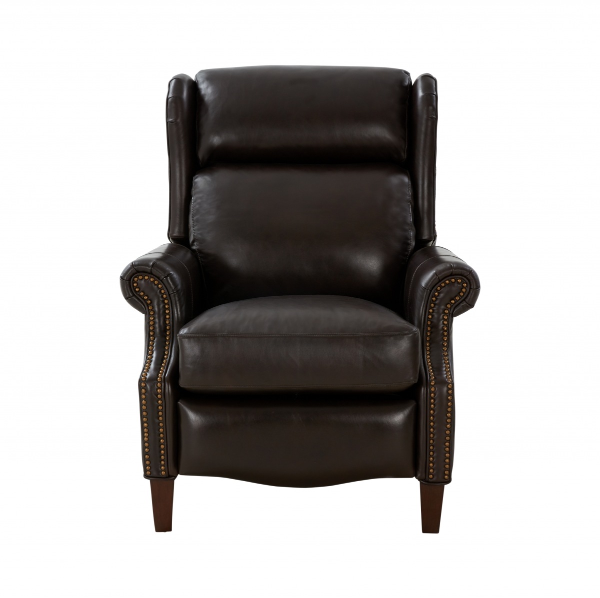 Push thru the arms 3-way low leg recliner with a 43.4” high winged pub back, kneed back rolled arms, loose non-welted boxed seat cushion with pocketed coil springs encased in foam, wrapped in Dacron with a feather blend topper, shaped ottoman board, footrest extensions, nail head trim accents, and tapered wood legs in a warm mahogany finish.Read More