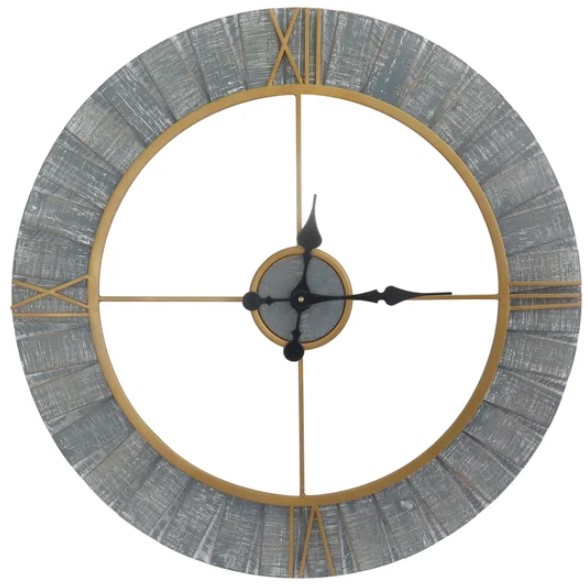 Clock Out is a circular clock that features a gray distressed finish along the clock's outer ring with golden outlines and Roman numerals. This clock has a diameter of 31.5" and can be mounted on the wall in your home or office. SN:XXX3828Read More