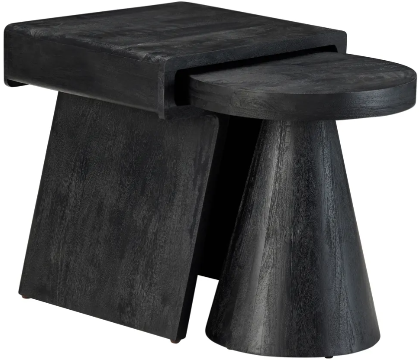 Elevate your space with this modern nesting table set, crafted from solid mango wood in a rich black finish with visible wood grain. The set includes two tables – a square table with an open slot and a round table with a conical base, designed to nest seamlessly in a compact footprint.Read More