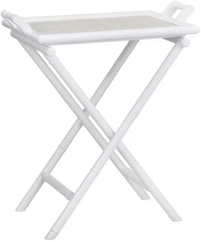 Mimicking the appearance of bamboo, the wood design is painted in a smooth white finish for a clean and simple aesthetic. A removable serving tray acts as the tabletop and features a stretched panel of natural rattan in a mesmerizing, open weave pattern. Be the ultimate host for friends and family with this stylishly functional table that exudes coastal charm.