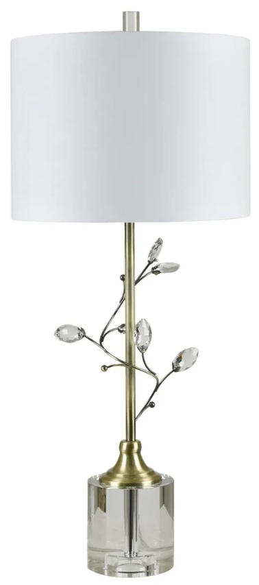 This contemporary table lamp seamlessly combines elegance and functionality. Its design features climbing branches adorned with sparkling crystal leaves, creating a refined, nature-inspired aesthetic. The polished brass stem beautifully complements the luxurious crystal base and the cylinder-shaped crystal finial. Topped with a white linen drum shade with a polyester interior.Read More