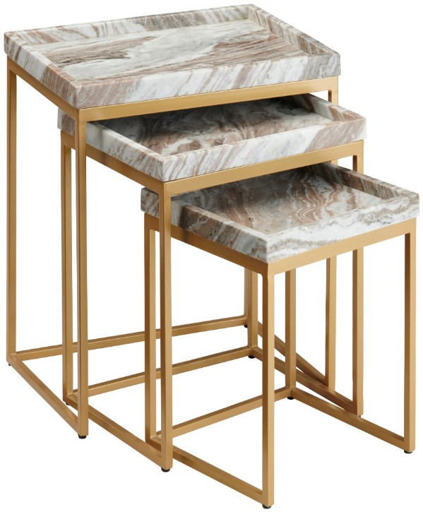 Sleek and sculptural, this three-piece nesting end table set combines polished sophistication with smart function. Each square table features a marble top showcasing natural swirls of white, brown, and gray, paired with an open metal frame in a brushed gold finish.Read More