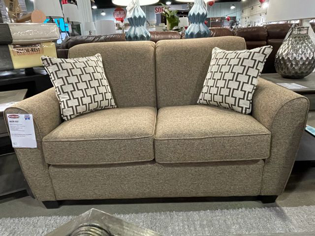 This Loveseat by Decor-Rest Furniture features a transitional design with sinuous construction and tight back with welted details around the piece in the same grey color fabric and tapered arms with tapered block feet in dark brown finish.