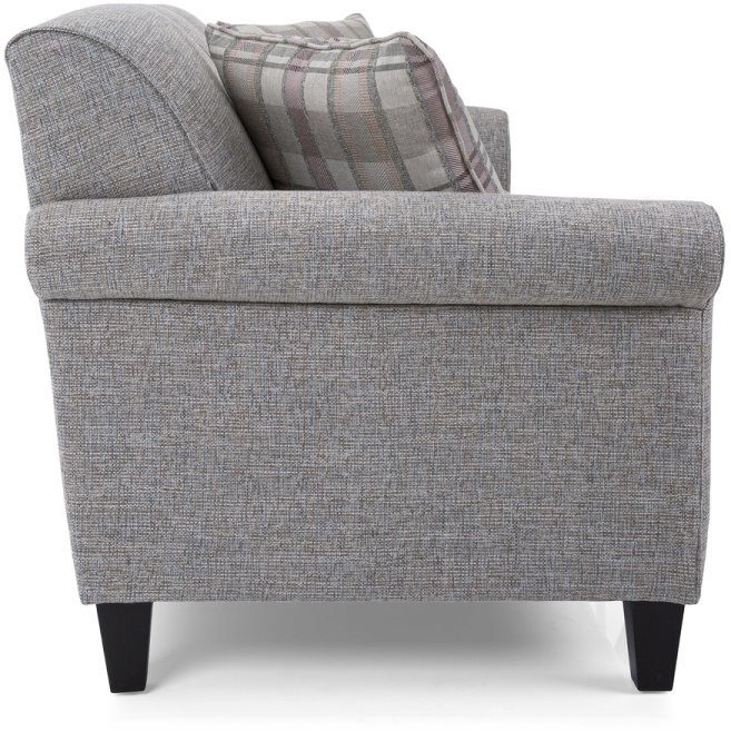 This sofa reflects a great combination of comfort and style. With thick padded tight back cushions and three welded seat cushions, this couch is one everybody wants to lie in, or just lie on. The rolled welded arms of the sofa and the exposed wooden legs add sophistication to your living room. Come with two decor-pillow accent