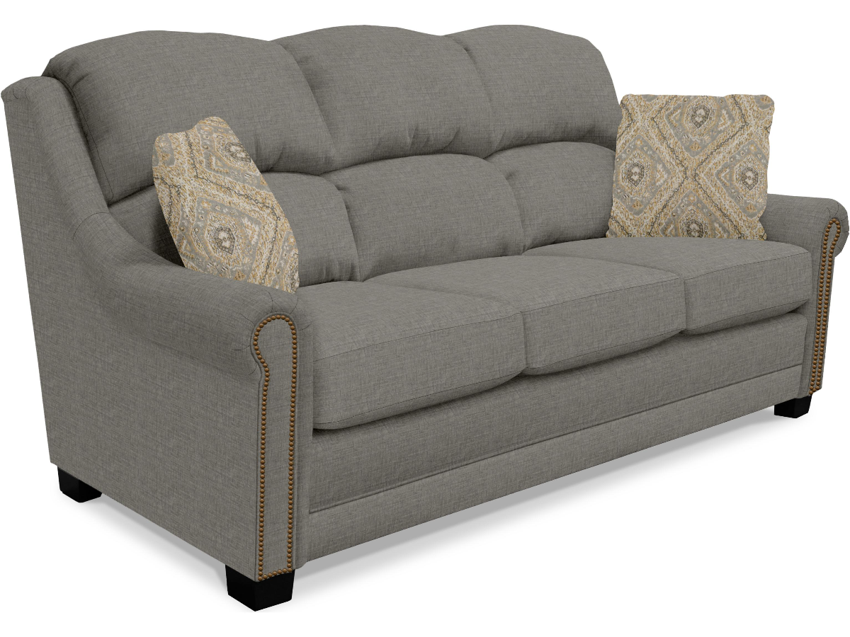 Both classic style and plush comfort unite with our Dawson collection. This silhouette features a bustle back, pyramid block leg, and a simple rolled arm accentuated with an optional antique brass nailhead trim. Available as a sofa, loveseat, chair, and ottoman.Read More