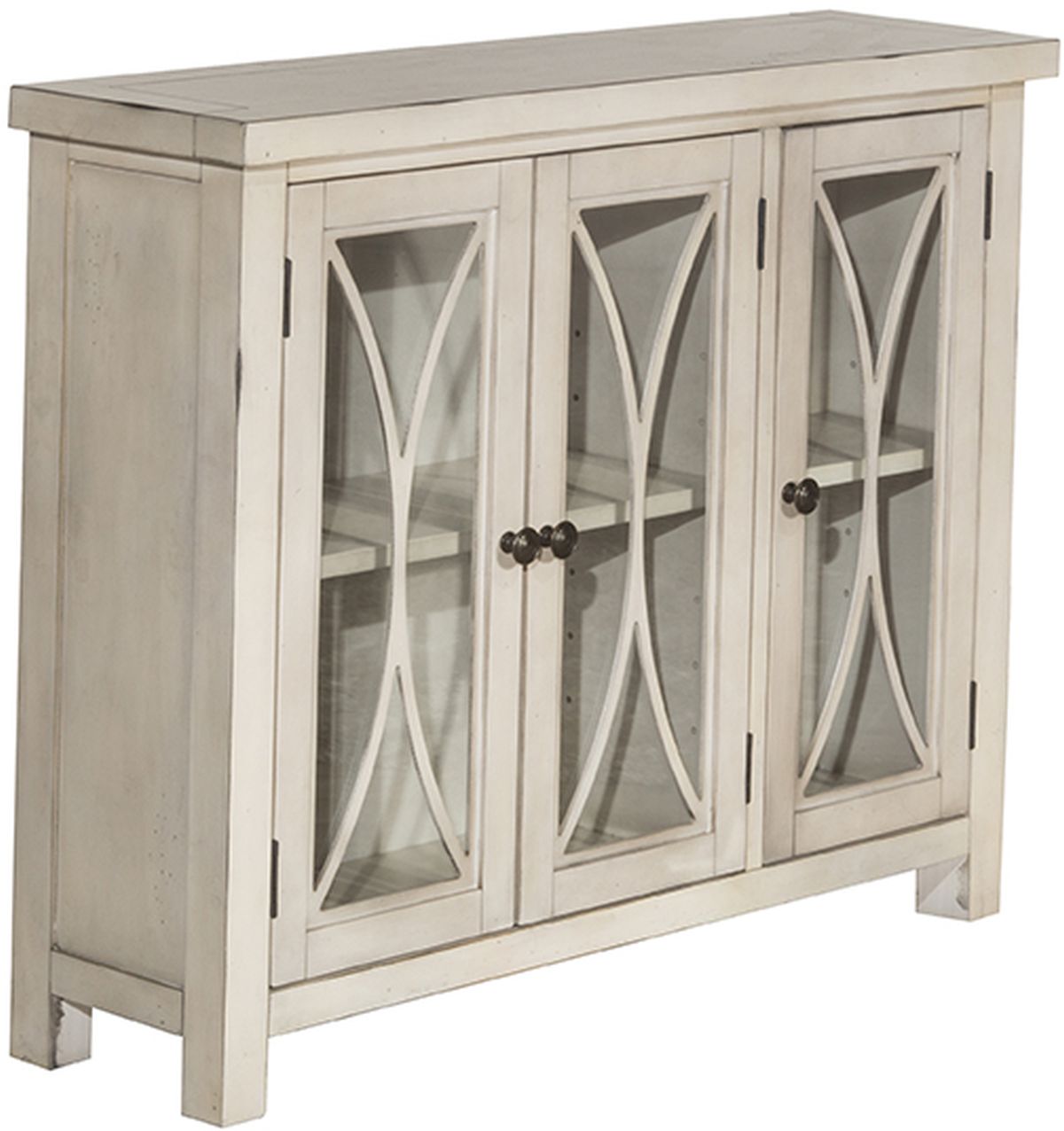 Storage and style take center stage in the Hillsdale Furniture Bayside Three Door Cabinet. Its three glass pane doors feature a sweeping and curved X design -- and paired with the Antique White finish -- this display cabinet is a picturesque addition to any cottage or coastal interior design scheme. Features two removable shelves behind cabinet door. Elegantly store and showcase your china and curios or other prized possessions with the Bayside cabinet. Some assembly required.