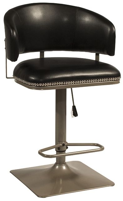 Adjustable Pelfrey stool can be used at a bar or counter height surface. Constructed of metal, champagne finished pedestal base, barrel shaped black faux leather upholstered and a hydraulic lift height adjustments.