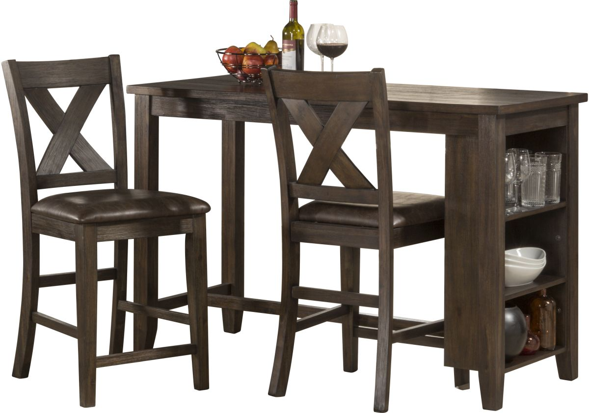 Dark espresso (wirebrush) wood finish with saddle brown faux leather. Set includes two counter height X-back non-swivel stools and the counter height dining table.Read More