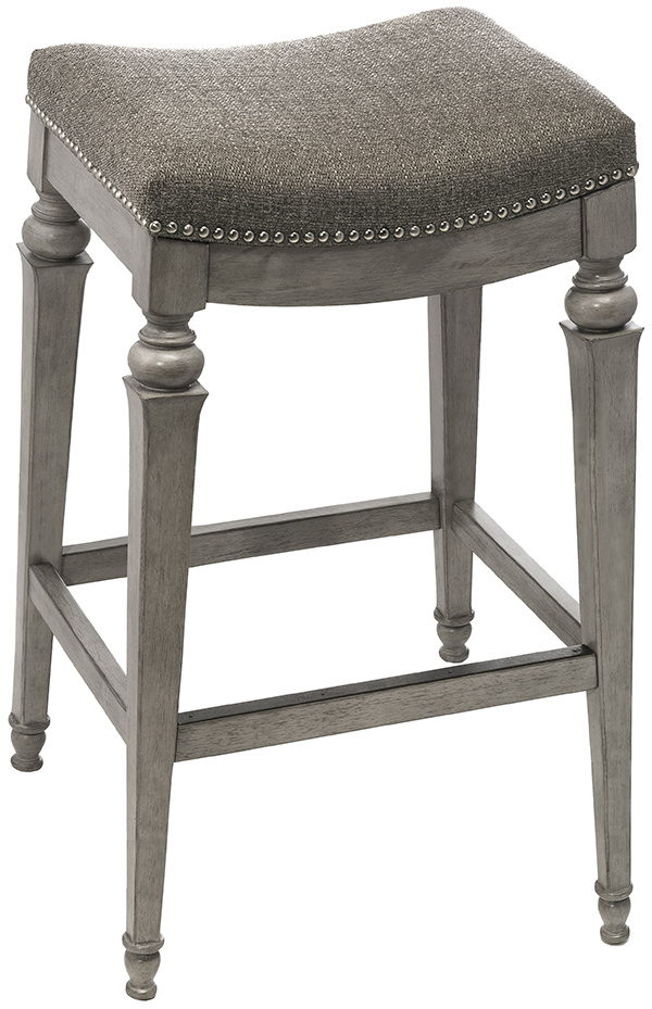 Rectangular stools are on-trend and unexpected, and Hillsdale’s Vetrina Stool is a showstopper in multiple colors. Available in both weathered gray and rubbed black palettes with matching seat upholstery, the Vetrina silver studding, ornate detailing on its tapered legs, and deep, lovely finishes in both colors. Available in bar and counter heights. Some assembly required.