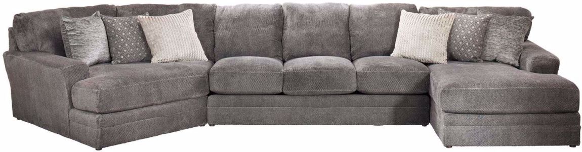 The Mammoth 3 Piece Sectional by Jackson Furniture cradles you as you sink into its oversized cushions and soft, textured polyester fabric. The neutral smoky gray color is sure to complement a variety of designs, as is the selection of nine accent pillows that add pattern and texture to the look.