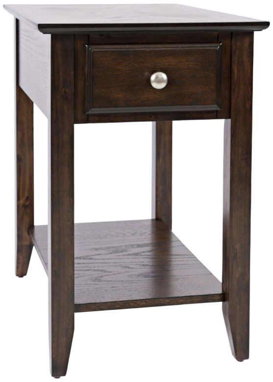 Sometimes, you just want a timeless look. Enter our Classics collection. Providing elegant, subtle looks with rich finishes with outstanding functionality. This chairside table features a butterfly matched veneer with straight-edge banding on the table top, an espresso finish, one drawer, and one shelf for open storage or display.Read More