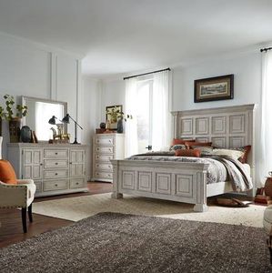 Live life beautifully with the Big Valley California king panel bed, dresser, mirror, and chest. Crafted of rubberwood solids with wood products, this kit features a whitestone finish with heavy distressing, wood framed doors and drawers.Read More
