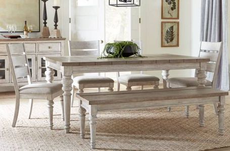 7-piece dining room set includes a rectangular leg table, 4 side chairs, and a bench