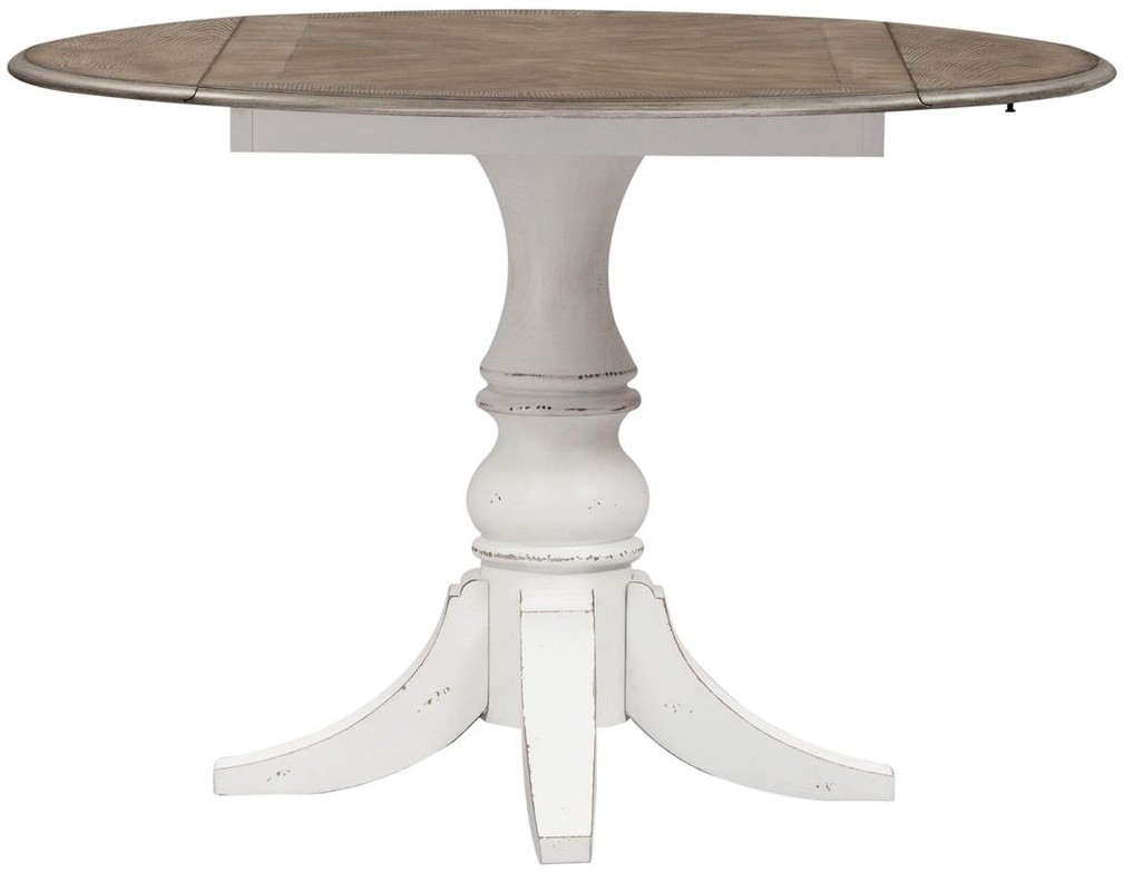 Gather in style with the Magnolia Manor drop leaf table. This piece features the perfect blend of European design with a weathered brown top accented by whitewash, two drop down leaves allowing flexibility making this a perfect piece for a small dining space, splayed legs, a fancy face top, and a turned pedestal base.Read More