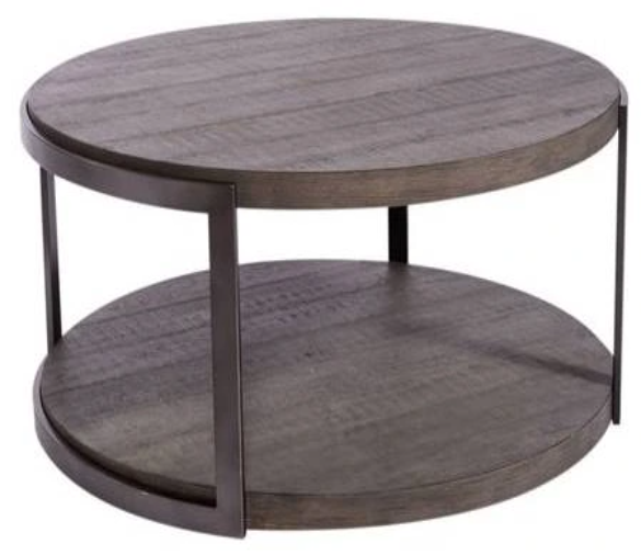 Design possibilities are endless with the Modern View round cocktail table. Crafted of metal with split heart oak veneers, this kit features a gauntlet gray finish, an open shelf design, a bottom shelf for additional storage, wire brush distressing, and dark pewter metal legs. Add this contemporary table to your modern-styled home.Read More