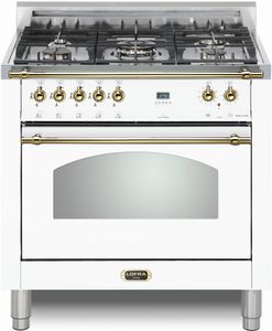 LOFRA® Dolcevita 36" White Pro Style Dual Fuel Range features 5 brass burners and matte black burner caps, ventilated doors with Cooling System Height adjustable stainless steel legs, and a large multifunction convection oven: 9 cooking modes.Read More