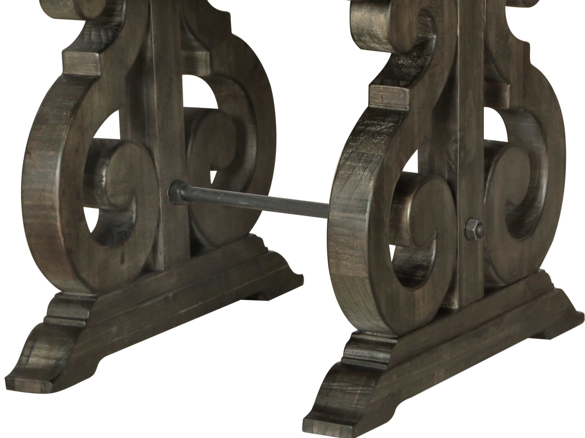 Old World charm abounds in the Bellamy table collection. Gracious S-curved carved bases support overlaid solid pine tops finished in vintage inspired Deep Weathered Pine. Matte black with pewter highlights metal stretchers and hardware create the perfect accent to set the mood for stunning European influenced elegance.Read More