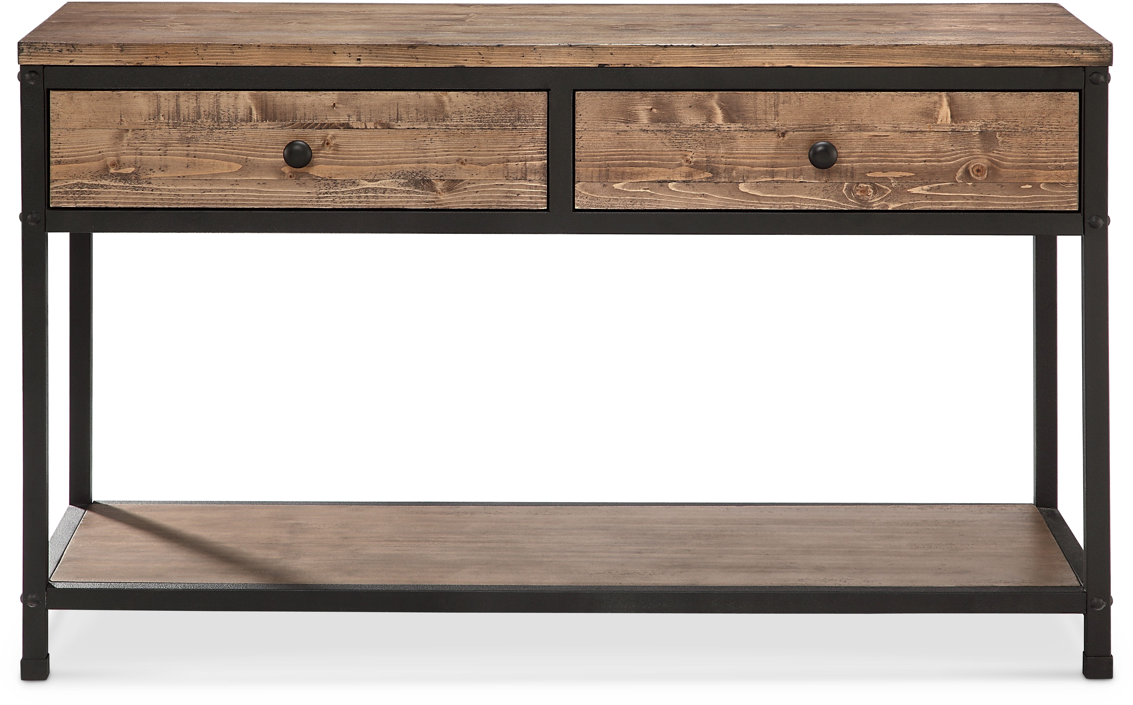 • Constructed of pine veneer over MDF and metal • 2 Drawers, bottom shelf, and metal frame• Rectangular top design • Dimension: 116.84cm W x 43.18cm D x 71.12cm H
