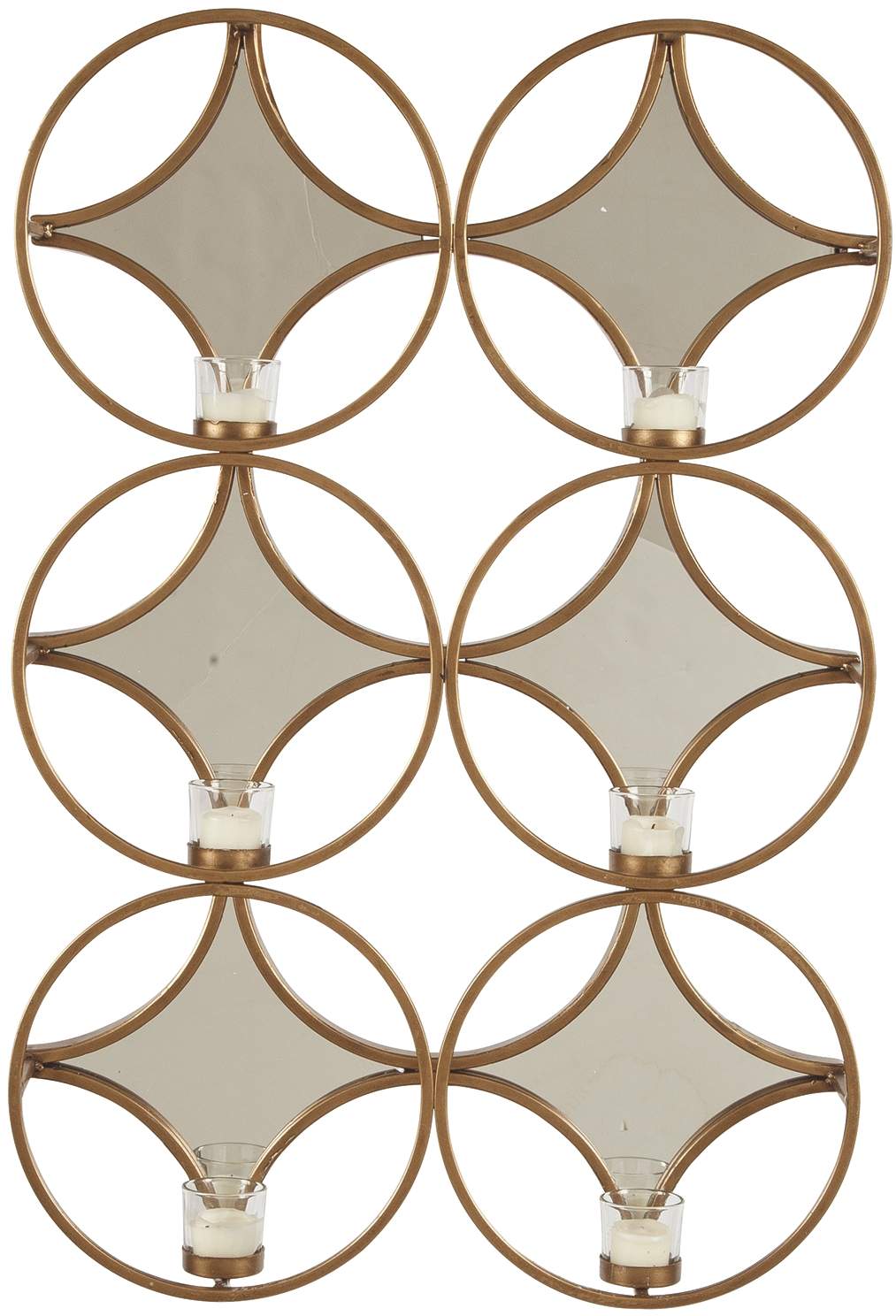 The Emilia wall sconce features mirrored glass, looping gold-tone metal, and allows for the added ambiance of 6 tea light candles (not included).