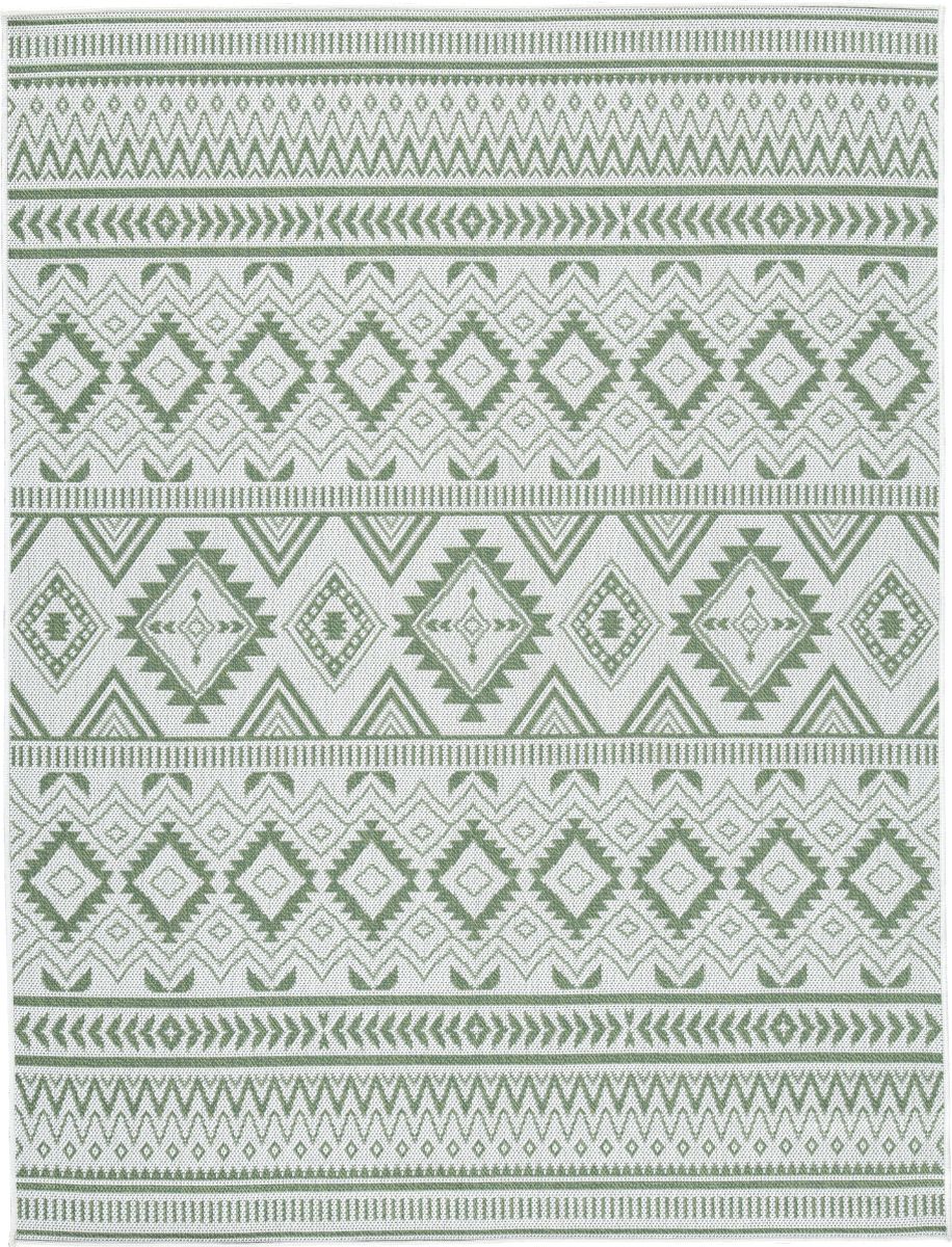 This rug takes a dynamic approach to casual style. Suitable for indoor and outdoor spaces, it sports a tribal design in cream and green. Pair it with complementary patterns and palettes to add an eye-catching element to your decor.Read More