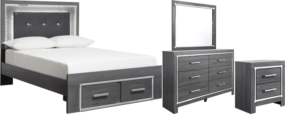 Includes an Qeen panel storage bed with 2 drawers (headboard, storage footboard and side rails), 6 drawer dresser, mirror and two drawer nightstand