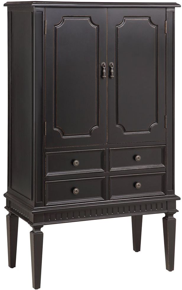 Two-door, four-drawer cabinet with one adjustable shelf and wire management on back panel. Hand-painted black finish . Raised panel doors . Frieze pattern above tapered legs.Read More