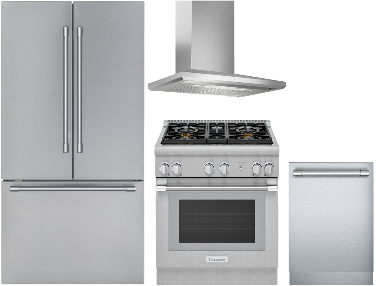Thermador® 4 Piece Stainless Steel Kitchen Package with a french door refrigerator, built in dishwasher, pro style gas range and wall hood.Read More