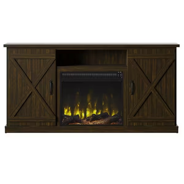 For the piece that sets the perfect modern farmhouse tone in your home, this TV stand with electric fireplace is just the thing, with its planked top and saw cut mullions this TV stand for flat screen TVs up to 70 in. and 70 lbs. offers a beautiful, rustic design while the electric fireplace provides warmth for a cozy night in. the 4,600 BTU heater provides supplemental zone heating for up to 400 sq. ft. to help you save money, while adding a cozy vibe to your home. Flame effects also work with or without heat so you can enjoy the ambiance of a fire any time of year you can even customize the look of your electric fireplace with either contemporary fire crystals or a realistic log set with ember bed - both are included.