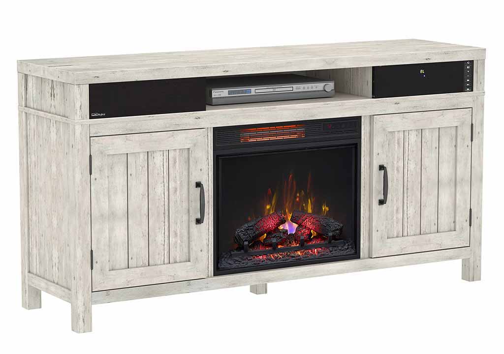 With fresh, rustic style that fits your look whether it’s modern farmhouse, coastal cottage or something entirely new, the Melissa Bluetooth® Compatible TV Stand with ClassicFlame® Electric Fireplace completes any room. It supports TVs up to 70 inches or up to 105 pounds and adds warmth and ambiance as it heats up to 1,000 square feet. When you add the optional Bluetooth® compatible speaker kit, it allows wireless streaming for audio from anywhere in the room or plays TV audio with a wired connection. And because safety is paramount, Safer Plug® fire prevention technology monitors the temperature of the plug and shuts off automatically if the plug gets too hot. The Old White finish on pine veneer and Antique Black finish hardware are the perfect complement to the ambiance of beautiful Spectrafire® flame effects that can be operated with or without the heat for year-round enjoyment.Read More