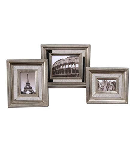 Marketing Description Antiqued mirror center panels surrounded by antiqued silver frames. Holds photo sizes 4x6, 5x7, 8x10. Frame sizes Sm-13x15x2, Med-14x16x2, Lg-17x19x2