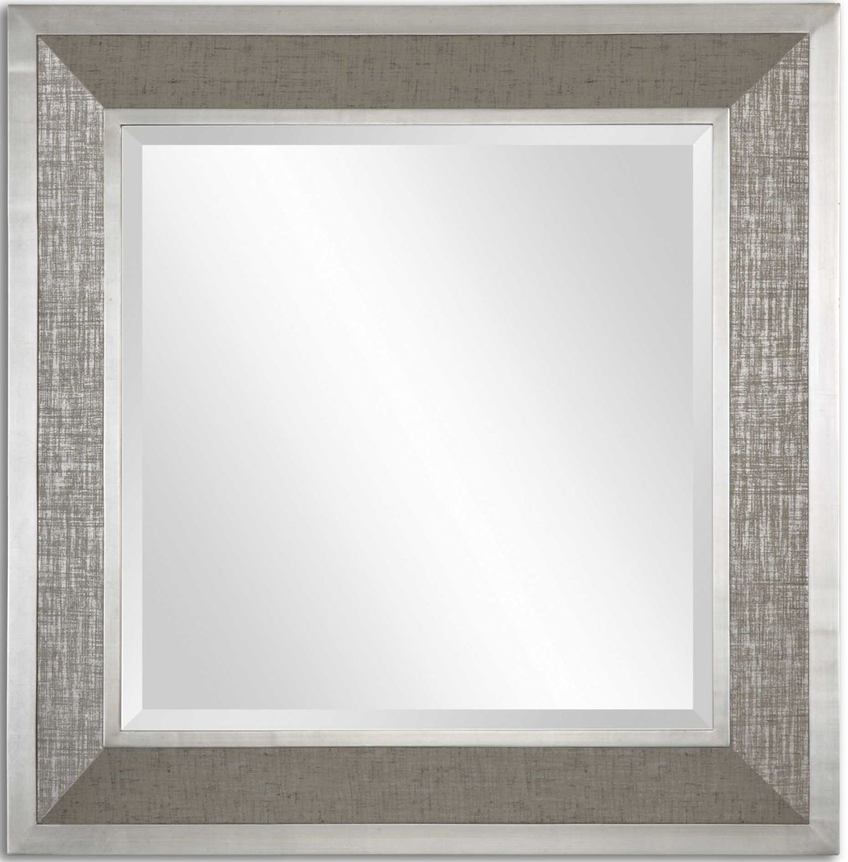 Frame has a metallic, silver gray wrap finish accented with silver leaf details. Mirror has a generous 1 1/4" bevel.