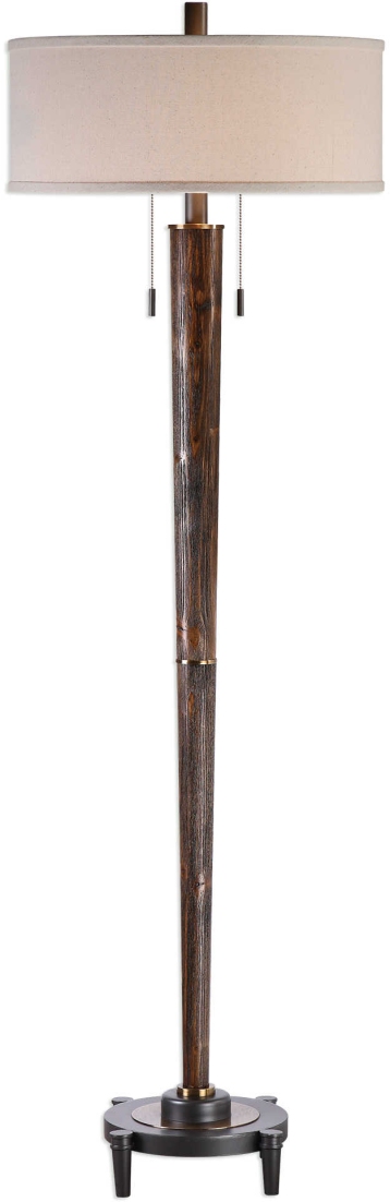 Tapered columns made of plantation grown hardwood, finished in a lightly burnished oak stain, accented with plated antique brass highlights and rust black details. The round hardback drum shade is a light oatmeal linen fabric with natural slubbing. The sleek and stylish design of this lamp brings an unique look to any space