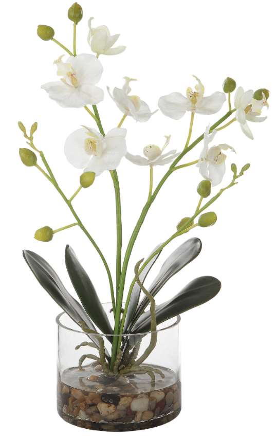 Symbolic of faith and beauty, this white orchid adds an elegant touch to any tabletop. The plant is placed in a clear glass container with faux water and natural river stones.Read More