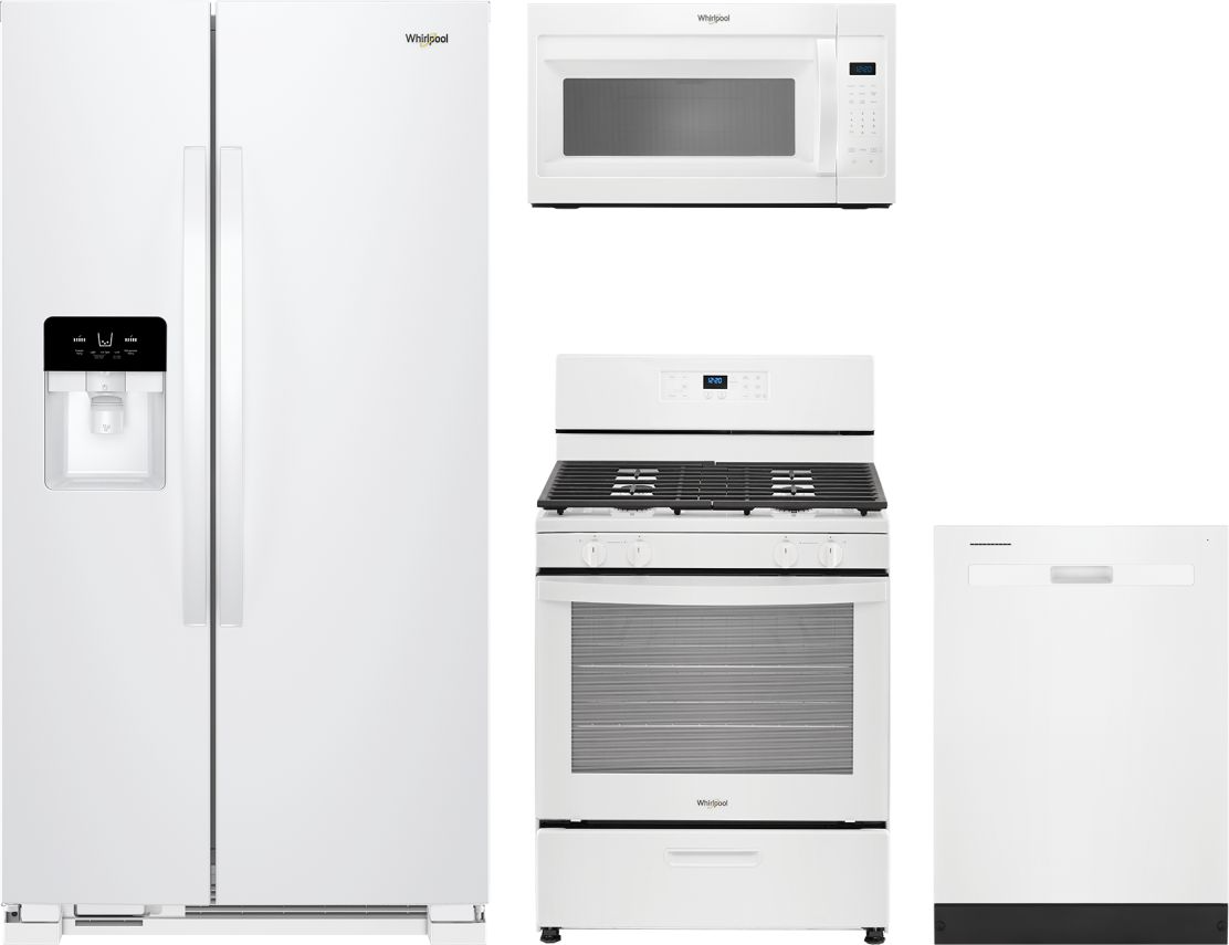 Whirlpool® 4 Piece White Kitchen Package with side by side refrigerator, freestanding gas range, built in dishwasher and over the range microwave.Read More