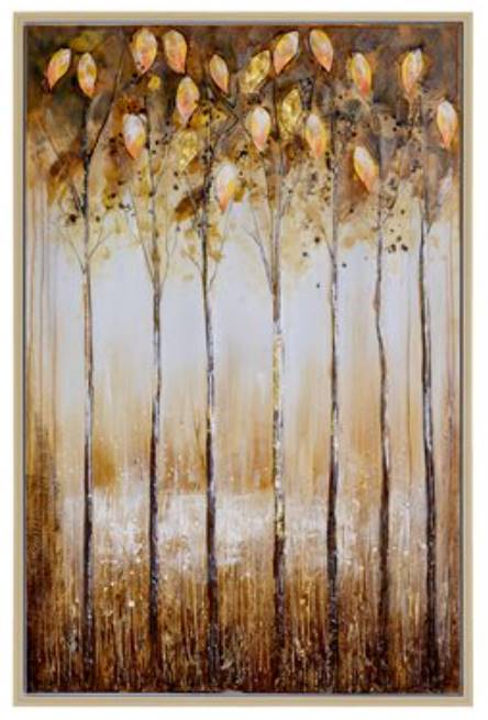 It centers around symbolic representations of sublimity and the natural world. Open to personal interpretation and artistic understanding, this select work is composed of a holistic array of golden backwoods trees, affixed by both root and canopy in two-sided emphasis on individual fortitude and the splendor found within nature's concord.Read More