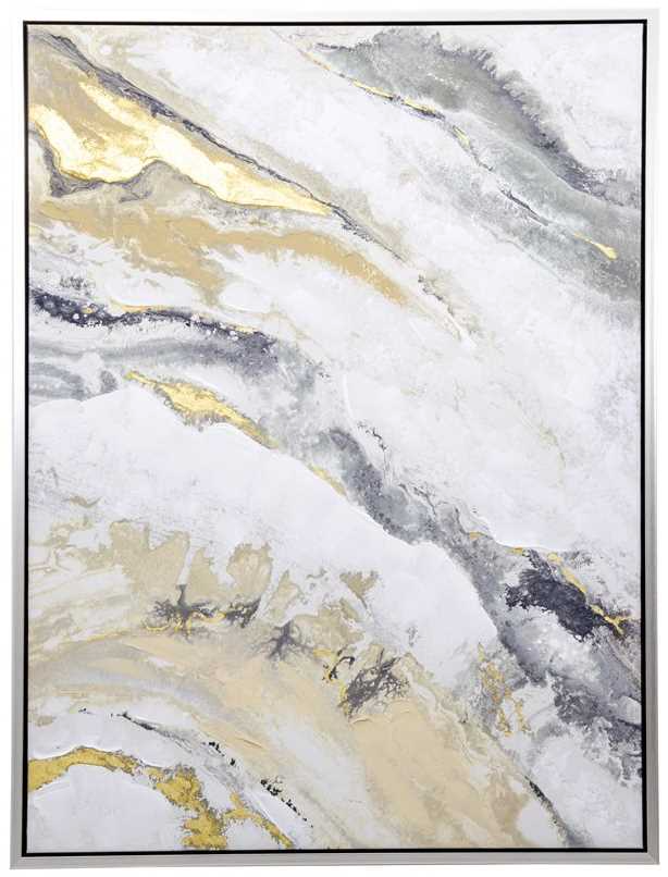This abstract hand-painted wall art inspired a spirit of relaxation and movement. It features handpainted neutral colors embellished with gold leaf accents. This wall décor will compliment a modern style home or office. Accented by soft a gray floater frame it inspires a gallery aesthetic.Read More