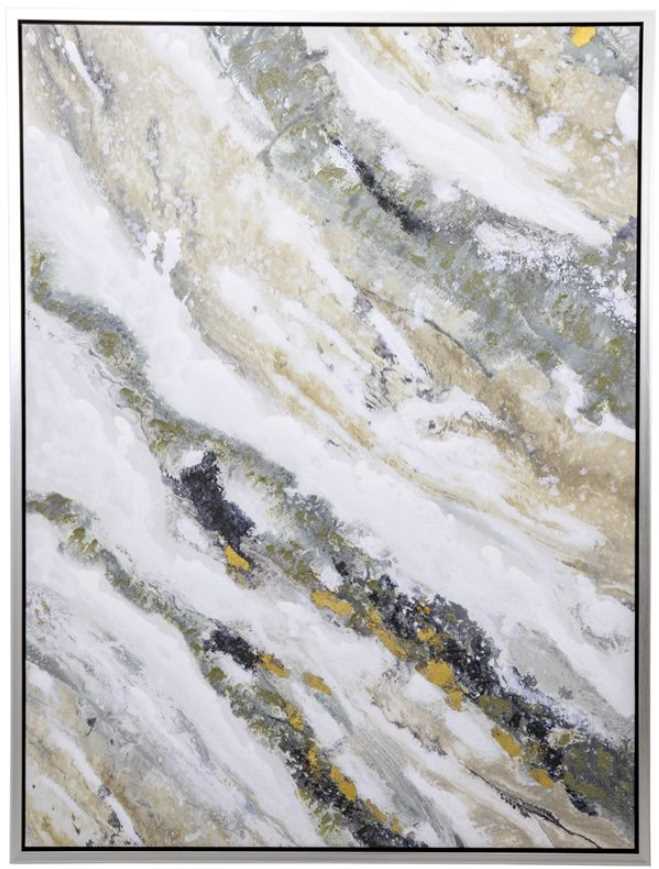 This abstract hand-painted wall art inspired a spirit of relaxation and movement. It features handpainted neutral colors embellished with gold leaf accents. This wall décor will compliment a modern style home or office. Accented by soft a gray floater frame it inspires a gallery aesthetic.Read More