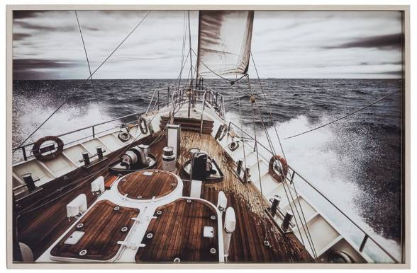 It depicts sailing yacht cruising through dark sea waters on a cloudy day. Because of the subjective camera angle it gives the viewer the feel of steering that yacht through refreshing breeze towards new goals. This piece has adjustable mounting brackets for easy hanging.