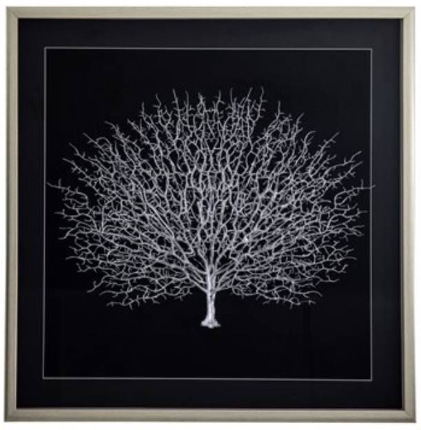 The white faux sea fan is mounted on a soft black linen background. The glitter accents add a touch of sparkle to the piece. Encased under glass with silver frame, it highlights the shadowbox' s clean look. Combine this wall art with a matching piece from its collection for a balanced symmetrical composition.Read More