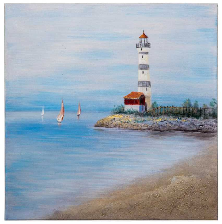 Shoreside features a striking scene of a lighthouse perched atop a rugged cliff overlooking the ocean. The lighthouse stands tall and proud, with its white and gray stripes contrasting against the blue sky and sea. The colors in the painting are muted and soft, creating a calming and peaceful atmosphere.Read More
