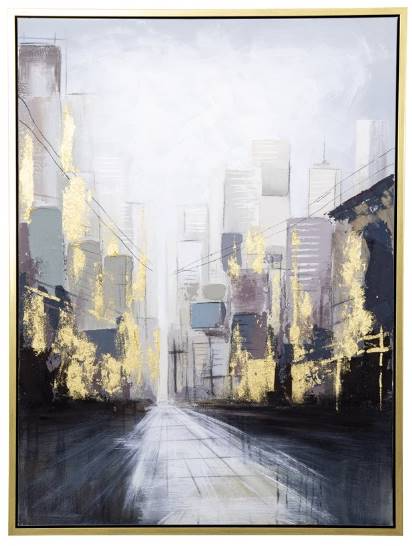 Remember the city life with this vibrant wall decor. The hand-painted black, gray, beige, tan and silver tones are enhanced by the textured gold accents that add depth and movement to the scene. Accented by a gold floater frame, it creates a gallery-inspired look. Hanging hardware is attached to the back.Read More