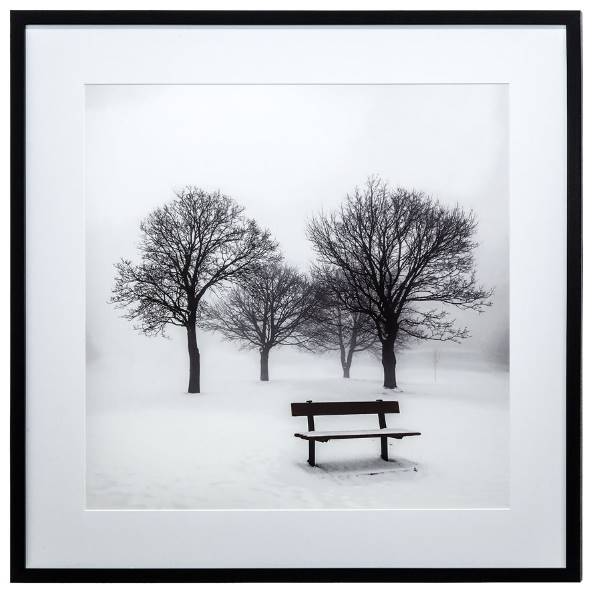 This scene printed with a white matboard under glass is encased in a smooth black frame and ready to be added to any decor. The snow covered bench with slumbering trees contrast against the stark white conditions perfectly encompassing a tranquil morning.Read More